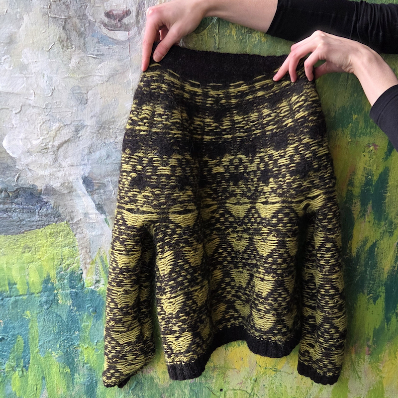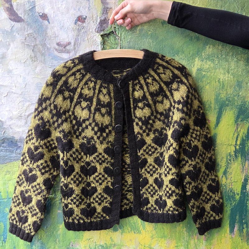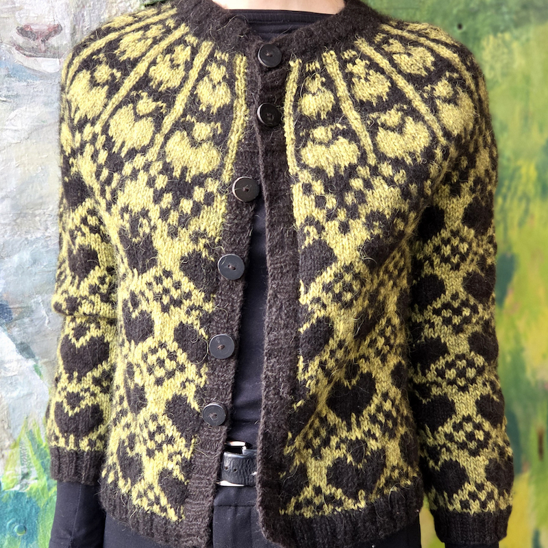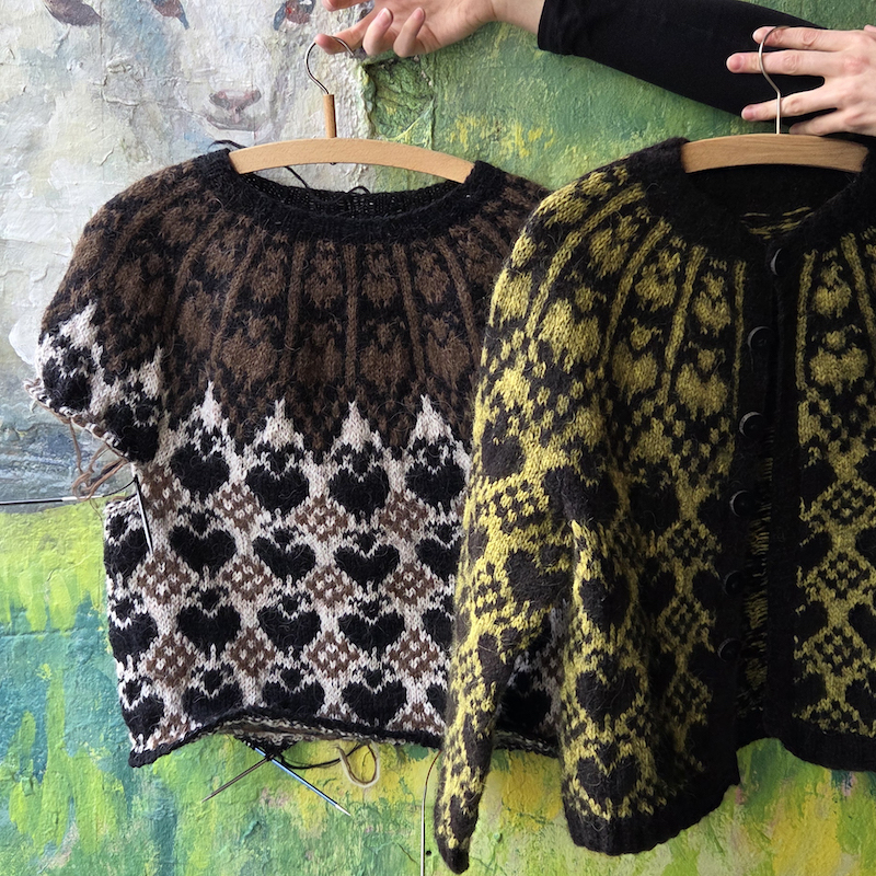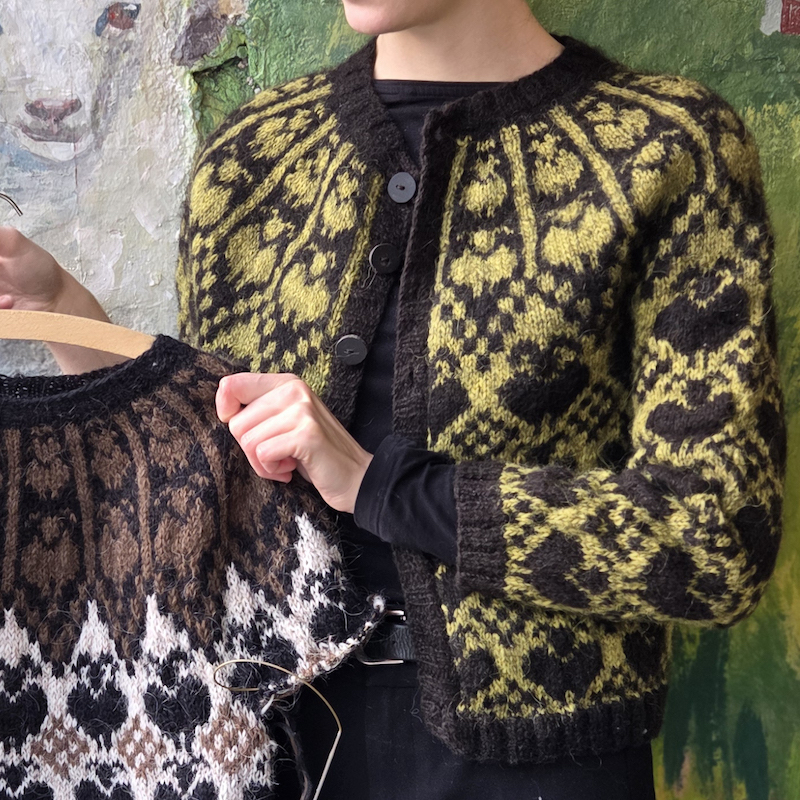 Techniques: tricot en rond, jacquard á fils flottants, Ladder back jacquard en option, steek pour la version cardigan, rangs raccourcis.