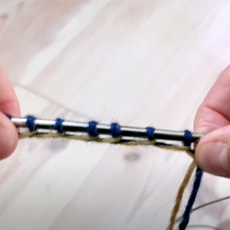 Je suis cependant perplexe de voir de plus en plus de publications sur les réseaux sociaux expliquant que ce montage n’est pas du tout élastique, mais fait juste des mailles plus lâches. Ces publications prouvent leur point en montrant que le fil jaune utilisé pour les nœuds (c’est-à-dire le fil tenu sur le pouce) est plus court que le fil bleu utilisé pour les boucles.